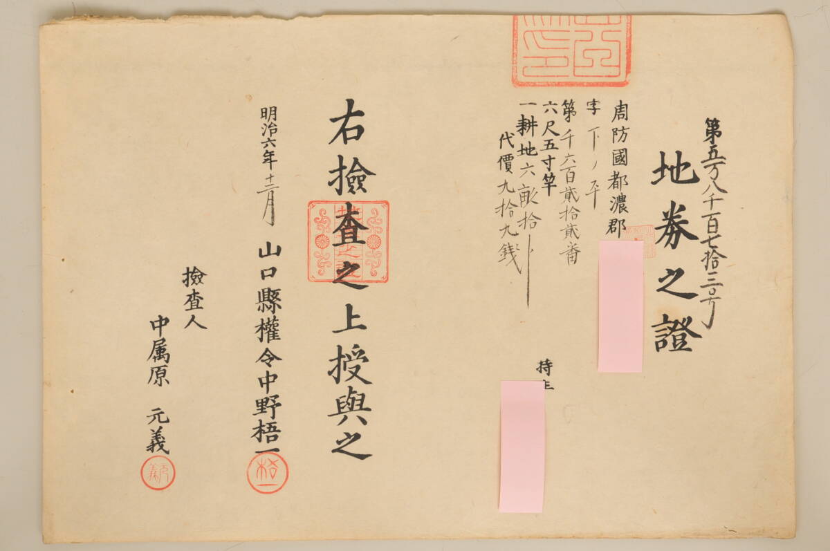 古い地券之證《24》【山口県】周防國都濃郡 現在の周南 明治6年 地券 古文書 土地 証明書 証書 證書 古書